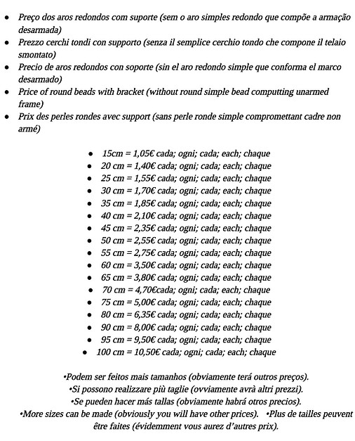 Por favor tenha , também, em atenção de que os preços aqui apresentados poderão vir a sofrer alterações por consequência da alteração dos preços das matérias primas. No entanto resolvi incluir mesmo assim esta informação aqui por ter notado que muitos dos visitantes deste site temem entrar em contato por achar que, por o meu trabalho ser artesanal, terá necessariamente que ser demasiadamente dispendioso. Pretendo com este preçário demostrar o contrário. Pois quando me refiro a preço justo faço-o tendo em perspetiva tanto o meu trabalho como os clientes.